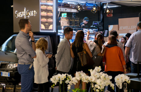 Su richiesta, Sushigold allestisce sushi corner all’interno degli stand; dalle linee sobrie e aggraziate, il suo ristorante su ruote offre alle imprese tutte le potenzialità di un catering dedicato e l’opportunità di far vivere ai propri ospiti emozioni esclusive: il sapore di una cultura e di un mondo lontani.